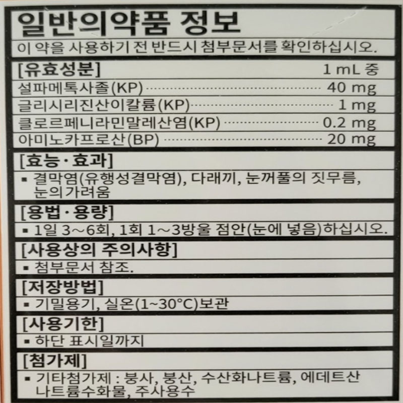 안약 성분으로 설파메톡사솔, 글리시리진산이칼륨, 클로르페니라민말레산염, 아미노카프로산 같은 성분으로 다른 약품도 사용하여도 됩니다.